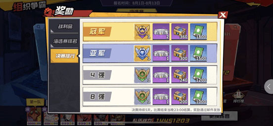 奖励分为个人奖励和组织奖励,组织奖励海选赛可以获得卓越增幅碎片以及专属道具碎片箱(里面是疫苗人和背心尊者的超绝道具碎片)决赛主要包括徽章及典藏底座。个人奖励每人需22:00以后自行领取,该奖励不会通过邮箱以邮件的形式发送给你,里面主要包括精致底座等,注意若个人物资达到200可以再开一次,个人物资每次进攻可以获得,胜利可得40物资,失败可得20物资。