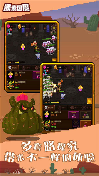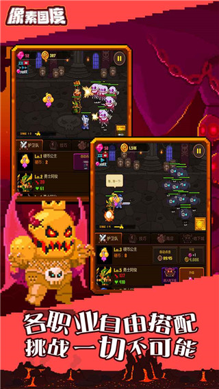 1、游戏采用经典的像素风格,玩家需要招募护卫队,保护公主前往地下城,迎接魔王的挑战。