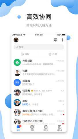 3、内部通讯录与组织架构实时同步,查找同事时无需额外添加好友,直接即可发起一对一或群组对话。