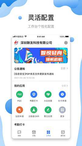 3、依据员工所属部门、岗位角色生成差异化的个人工作台,不同职能人员进入后看到的核心应用与信息流各不相同。