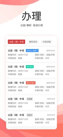 2、网上办理模块使老干部能够在线申请出国(境)、兼职报告及参与问卷调查,简化了办事流程。