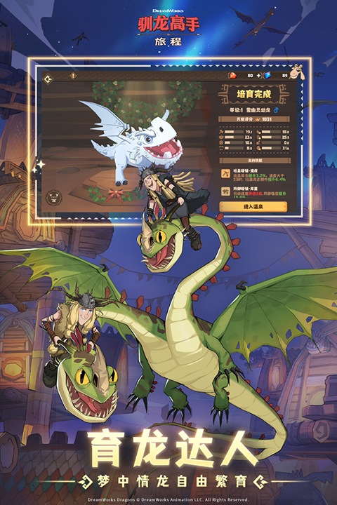 驯龙高手旅程无限钻石版是一款以梦工厂动画电影系列驯龙高手为背景的模拟经营育龙手游,玩家将在这个充满魔法与冒险的奇幻世界中,体验与龙共舞的奇妙旅程。龙与人类的深厚友谊为游戏注入了丰富的故事情节,玩家将化身为勇敢的龙骑手,与自己的龙伙伴并肩作战,守护家园的和平与繁荣。每一次飞行都将带来心跳加速的快感,探索未知的世界,书写属于自己的传奇故事。