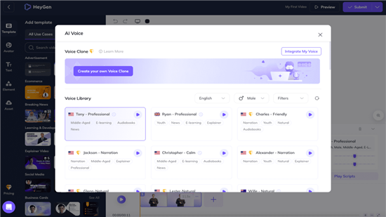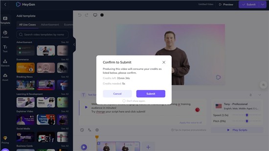 4、heygen还提供丰富的内容库,用户可选择背景和添加元素,使视频制作更加多样化。