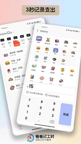 卷卷记工时是一款为工人、兼职人员和自由职业者等群体提供记工计时服务的实用工具软件。软件通过自定义记录收支明细和实时追踪工作时间,帮助用户轻松完成工作打卡与时长统计等需求。详细记录工作相关信息,包括工作日期、收入明细以及请假记录等,确保工作班次和考勤状态一目了然。具备对不同场景下的工作收入和工时数据进行统计分析的能力,帮助用户精准掌握工作整体情况,摆脱传统的手动记录方式。