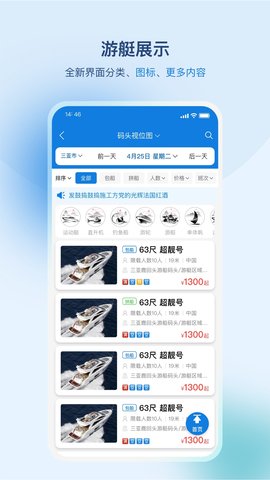 2、游艇展示界面经过精心分类,图标设计新颖,使得用户在选择游艇时更加直观。
