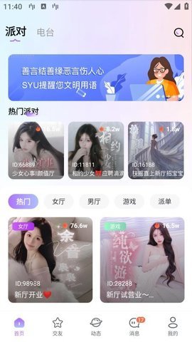 SYU是一款以娱乐交友为核心的社交平台,用户能够通过实时语音互动的方式来结识有趣的伙伴,从而实现真实的社交体验。平台在用户个人信息的审核上非常严格,确保每位用户的信息真实可靠,避免虚假交友的情况。SYU还提供多种交友形式,如热门派对、游戏和电台等,满足不同用户的交友偏好。实时查看各类动态,通过评论互动等趣味方式来拓展自己的社交圈。