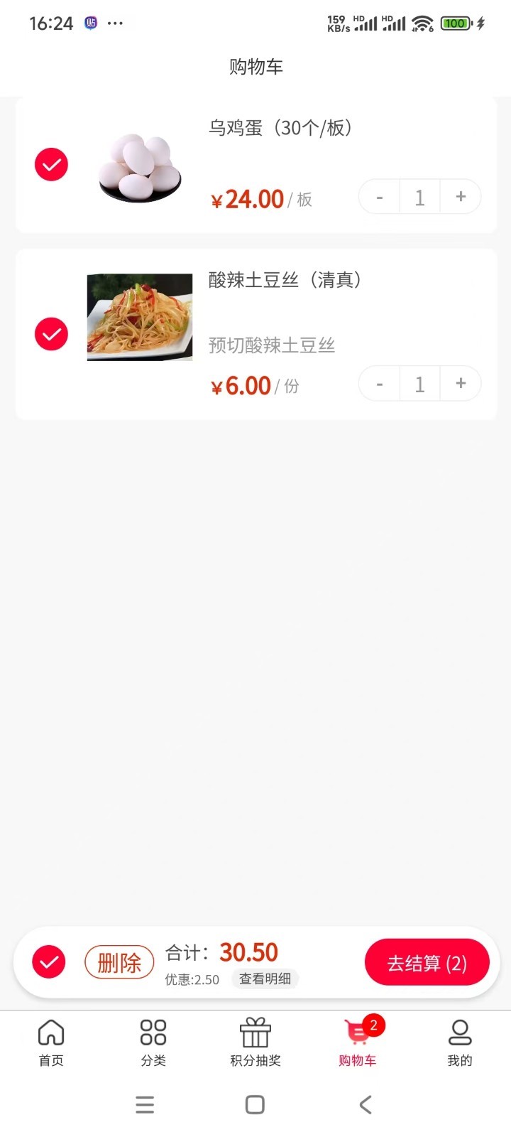 4、选择完毕后,用户将所选食材加入购物车,可以继续浏览其他食材或直接进行结算。