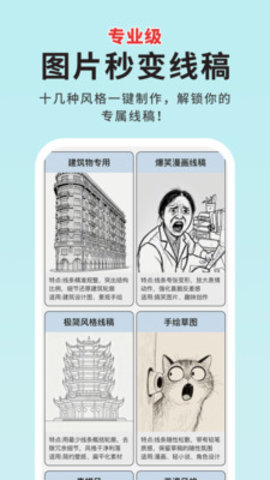 图片转线稿pro是一款功能全面的图片特效转换软件,为各类照片提供艺术风格的转化。不管是人物、宠物、建筑还是车辆,软件都能轻松将照片转变为精致的线稿或素描效果,操作过程简单易懂,不需要用户具备专业的技能。生成的作品不仅清晰优质,且适合用于创作临摹或设计参考,从而帮助用户节省时间,激发创作灵感。