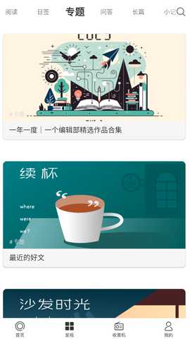3、用户可切换至发现栏,可以浏览多个优质专栏,涵盖各类文艺内容,用户可根据自己的兴趣选择阅读。