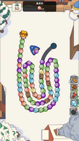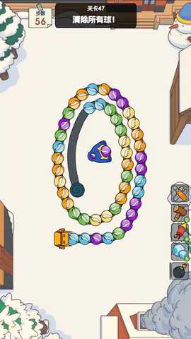 3、除了基础彩球,关卡中还会随机出现具备特殊效果的彩球,例如能够消除一整片区域的炸弹球,或是可以暂时冻结球串前进的冰霜球。