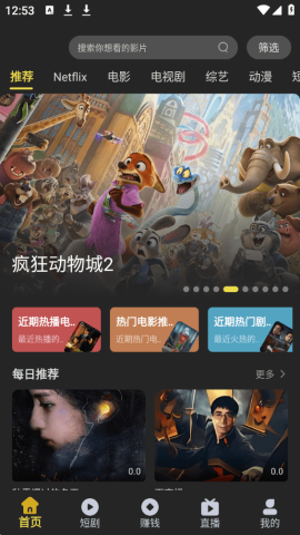 1、首页会展示各类推荐影片,可以直接点击海报进入播放页面。