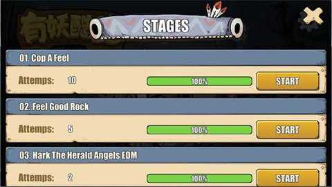 1、进入游戏主界面后直接点击开始冒险,随后在音乐列表中选择如鸡吉村狂想曲等不同曲目,每首曲子对应一套独立设计的关卡序列与障碍物组合。