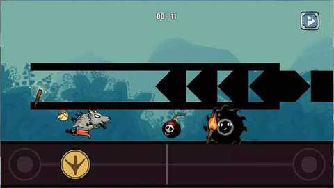 2、游戏采用分屏控制机制,左手区域负责点击使小鸡小吉跳跃或下蹲,右手区域则控制狼阿烈进行格挡或冲刺,两者行动需根据旋律配合。