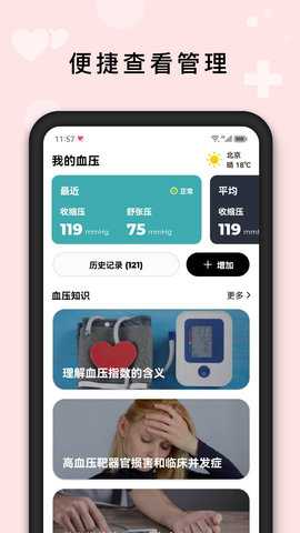 血压管理助手是一款能够协助用户进行日常健康数据追踪的移动软件,围绕血压与心率这两个核心指标构建了一套完整的记录与分析体系,将每日测量的数值录入系统,软件会自动整理这些信息并生成长期趋势报告,应用内还整合了与心血管健康相关的知识内容,这些内容经过筛选和整理,为用户理解自身数据背后的意义提供参考,使得健康管理的过程不再局限于简单的数字记录。