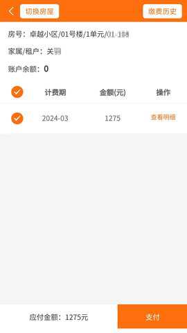 1、完成注册并登录后,在软件首页的费用缴纳区域,选择需要支付的物业费项目并完成支付。