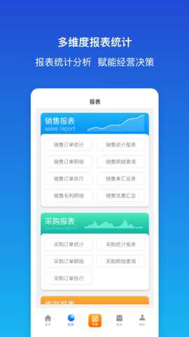 4、需要查看经营概况时,点击首页的数据报表,可以分别调出销售毛利统计、库存盘点表或客户往来对账单。