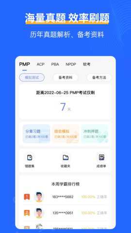 2、内置的模拟题库覆盖了PMP、ACP、NPDP等主流项目管理认证的考试范围。