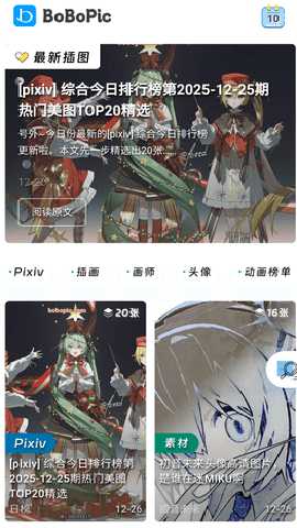 BoBoPic是一款每日同步更新Pixiv平台高清插画资源的在线社区,汇集了海量动漫、游戏同人及原创艺术领域的插画、漫画与小说作品,用户能够依据角色、作品或风格标签进行精细化浏览与筛选,整个平台按照主题与画师信息对内容进行了系统化归类,所有图片资源均提供从1080P到4K的高清分辨率,适合直接设置为移动设备或电脑的桌面壁纸,无需注册即可无限制地访问与下载全部内容,营造了一种轻松便捷的沉浸式欣赏体验。