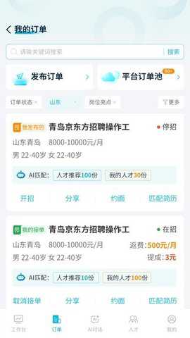 1、平台将代理招聘的发单、接单与进度跟踪流程进行了数字化整合,形成一个连贯的线上操作闭环。