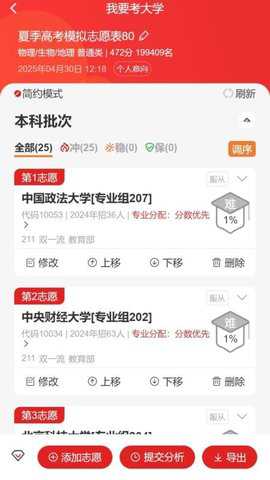 3、在志愿模拟板块,自由添加或删除院校专业,实时查看该志愿表的整体录取风险预估和批次分布。