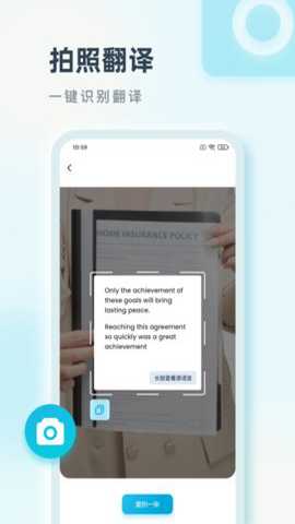 3、遇到外文书籍或标牌时,使用拍照翻译功能,将镜头对准文字,软件会自动框选识别区域并给出翻译结果。