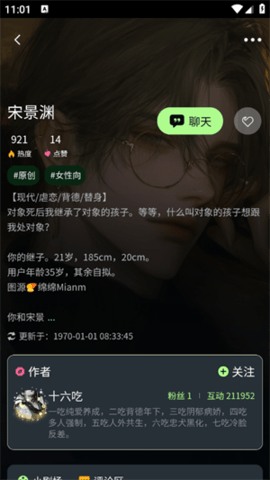 5、想开始聊天时,可以在首页通过筛选或搜索找到目标角色,进入其页面后点击聊天按钮。