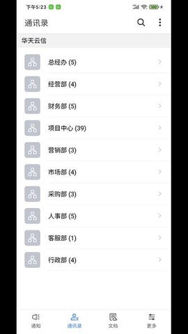 2、点击底部导航栏的通讯录,页面会以树状图形式展示公司所有部门,点击部门名称可展开查看该部门下的所有成员。