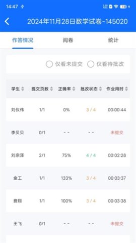 2、所有学生的作业提交状态、批改进度在一个界面集中显示,便于整体把控。