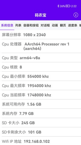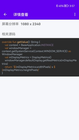 3、除了代码功能,还能快速读取当前手机的屏幕分辨率、设备型号和内存占用等硬件信息。