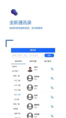 2、通讯录功能整合了厂内人员信息,支持快速查找、收藏联系人以及查看拨打历史。