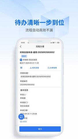 3、流程中心集中呈现所有待办、已办和发起的审批事项,如请假、报销等,状态变更会有明确提示。