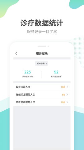 2、工作台整合了诊疗数据统计功能,各项服务记录清晰呈现,便于回溯与分析。