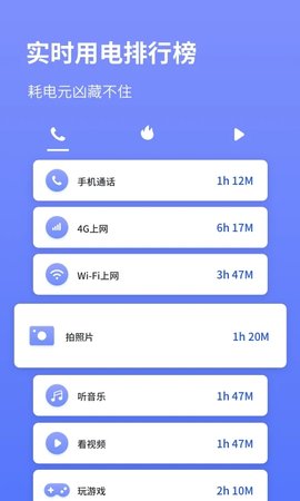 1、主界面顶部显示当前电量百分比与预估可用时间,下方以列表形式展示各应用耗电排名。