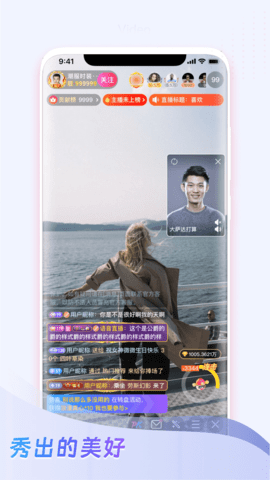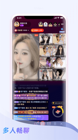 1、软件的核心是实时视频直播,用户进入直播间后,可以通过文字弹幕与主播和其他观众进行同步交流。