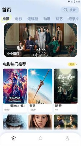 1、进入软件首页后,向下滑动可以浏览不同分类板块,例如电影推荐或热播剧集。