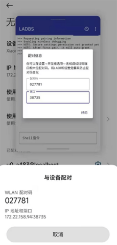 4、在小窗模式的LADB界面中,找到对应的输入框,准确填入刚才获取的配对码和端口号,完成首次配对。