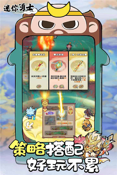 迷你勇士是一款以西游神话为背景的休闲策略塔防手游,将背包整理与塔防战斗相结合,修行者需要利用乾坤袋的有限空间来摆放各类法宝,迷你勇士手机版抵御妖怪的侵袭,关卡采用推进形式,击败怪物后有机会获得新的法宝、资源或扩展背包空间,相同的法宝可以进行合并,合并后不仅外观发生变化,攻击属性也会得到提升,主动选择法宝的攻击特性,应对不同波次的敌人和强大的首领。
