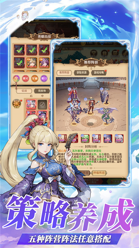角色分为五种不同阵营,彼此存在克制关系,布阵时需考虑阵营搭配以获得属性加成。