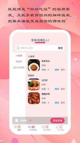 爱厨小典是一款情侣间美食互动与记录的工具,通过绑定关系形成投喂达人与饭搭子的组合,一方可以上传个性化菜单,另一方则能浏览并点选心仪菜品,软件内置了详尽的图文菜谱库,便于用户参照学习以提升烹饪技巧,每日心情与共同度过的天数都会被清晰记录,让相处的点滴有迹可循。