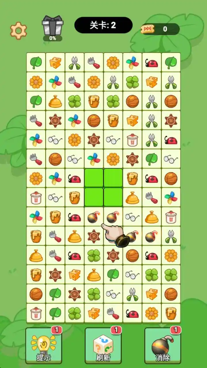 2、当画面中可消除的图标对较多时,不要急于点击,先观察整个布局,寻找能打开多处阻塞的关键消除点,进行长线规划。