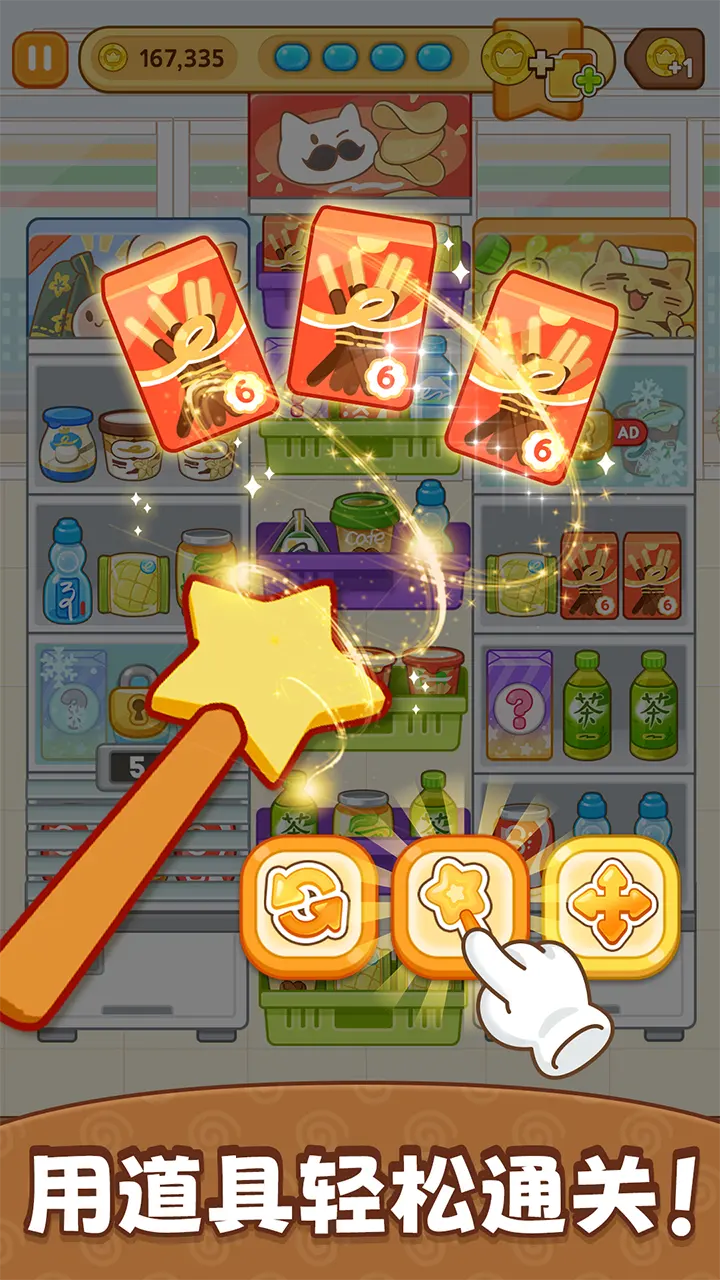 1、进入关卡后,首先观察所有箱子和货架上的物品分布,优先寻找那些能够直接进行三消匹配的相邻或易移动物品,快速清理出空间是破局的关键。