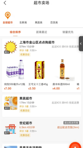 1、汇集了社区周边多家超市的商品信息,可以直接浏览选购,下单后由附近门店快速配送。