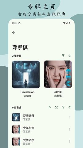 2、自动扫描手机存储空间,依据专辑、艺术家、文件夹等元数据信息,智能组建分类播放列表。