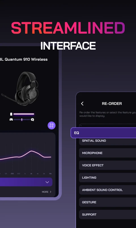 jblquantum智能耳机是一款专属定制工具,搭载QuantumSpatial空间音效技术,这项技术能够精准定位声音方向,为游戏场景营造沉浸式听感。包含游戏专属的EQ调节选项,允许用户保存个性化的音效预设。RGB灯光效果与耳机按键功能均可进行调校,音效配置文件可以同步,设备固件也能获得更新。