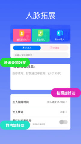 1、能够自动批量添加通讯录联系人及群组成员,有效扩大潜在客户的覆盖范围。