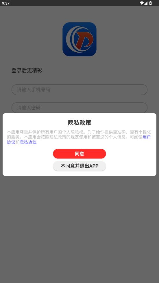 1、首次启动后阅读并同意相关的隐私政策条款,进入登录界面。