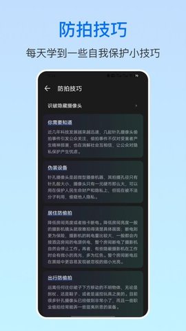 摄像头防偷拍是一款安全检测工具,用于发现住宿、出行等环境中可能存在的隐藏摄像设备。分析局域网内连接设备的网络活动与硬件信号特征,对异常行为进行标记和预警。用户能够启动扫描程序,对当前所处空间的电子设备进行排查,系统会生成检测报告并指出潜在风险点。整个过程无需复杂操作,即可完成一次基础环境安全检查。