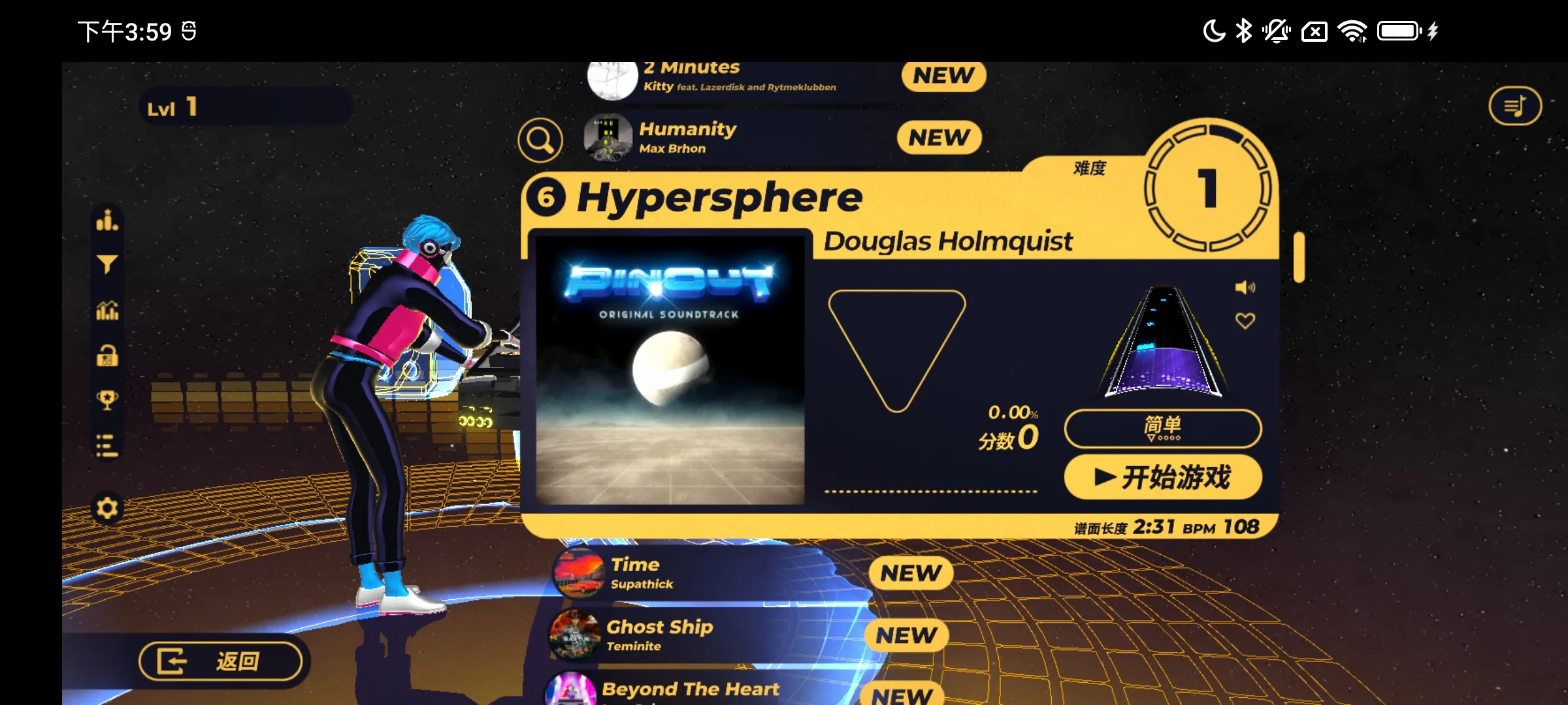 1、游戏开始前,在曲目列表中选择一首歌曲并确认难度等级。不同难度下,轨道上出现的音符密度和速度会有显著差异。
