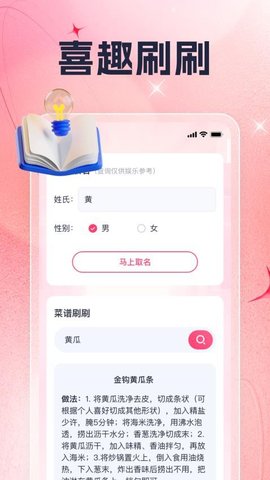 喜刷有福是一款集合了多种休闲益智与生活实用服务的移动工具。包含了丰富的谜题挑战,用户能够随时参与猜谜活动,在思考与解答的过程中锻炼逻辑能力。汇集了各类菜品的详细制作方法,方便用户查阅学习,提升烹饪技巧。还包含一项便捷的取名服务,能够根据用户输入的信息生成多样化的名称建议。
