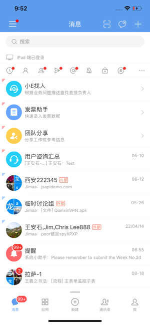 3、消息引擎实现了待办、通知与即时通讯的聚合,重要的工作提醒和同事消息会集中呈现在同一消息中心内。